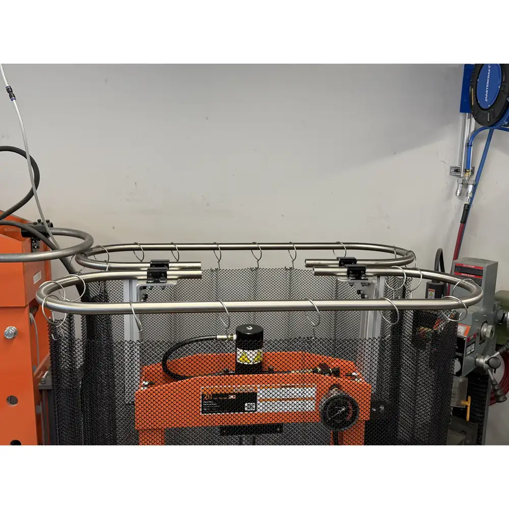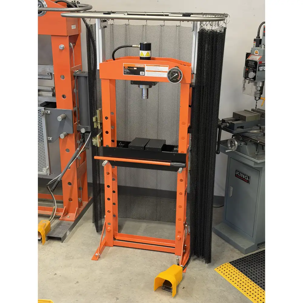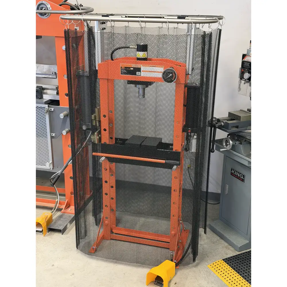 Lors de l’utilisation de presses hydrauliques, la libération inattendue de pièces, d’outillage ou de fragments peut représenter un risque grave pour les opérateurs. Ce rideau anti-éjection en treillis d’acier robuste constitue une barrière physique solide, aidant à contenir les débris projetés et à les rediriger en toute sécurité vers le sol, tout en conservant une visibilité claire de la zone de presse.
