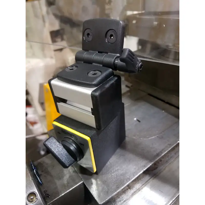 This simple-to-use magnetic base safety shield is great to have around the workshop. Just put it on any metal surface and turn on the magnet. A flat piece of polycarbonate is attached to the magnetic base with a locking hinge. The base will stick to any metal surface with up to 130 lbs. of magnetic force. It is easy to adjust the screen tilt to suit your needs.