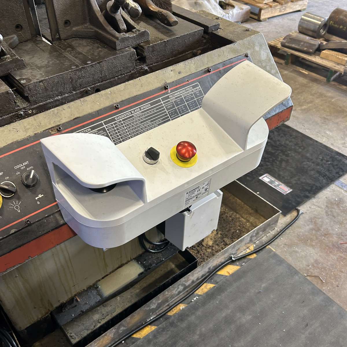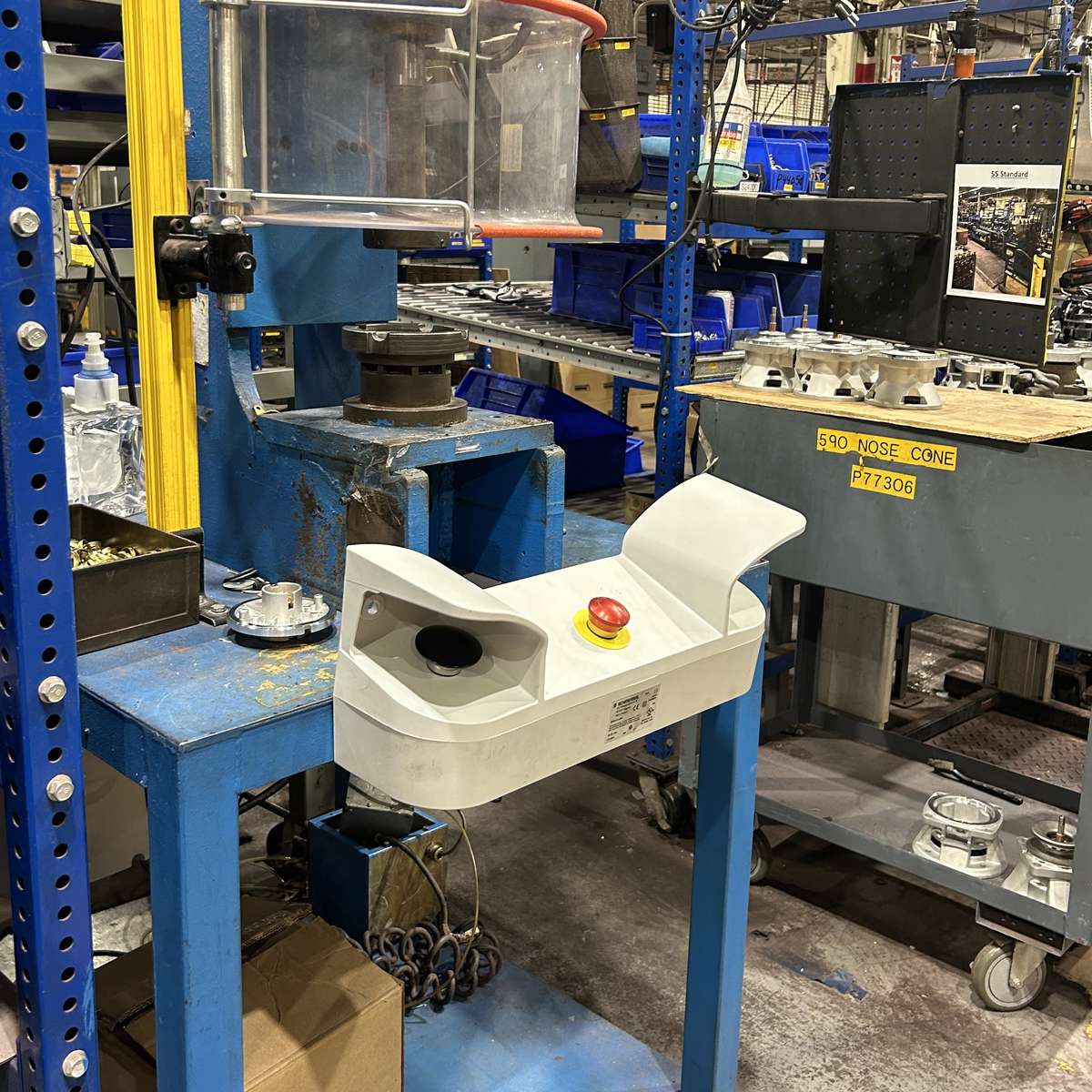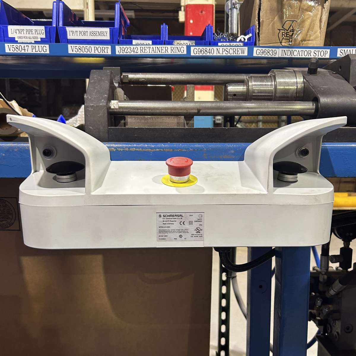 Two-hand control systems work with a dedicated monitoring relay that only allows a machine to operate when both hand controls are pressed at the same time. This setup ensures that the operator’s hands remain safely away from moving or hazardous parts during operation.